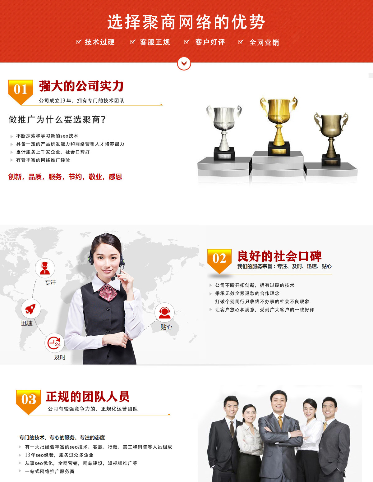 公司秉承“诚实诚信、勤奋务实、爱岗敬业、开拓创新、合作共赢”的企业精神,用心服务好每一位合作客户,聚商网络愿与各位朋友一起携手并进,共创辉煌!